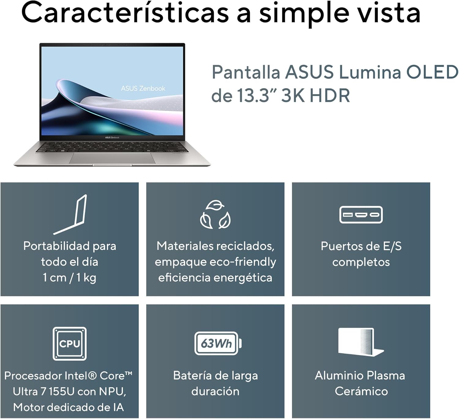 ASUS Laptop Zenbook S 13 OLED 2024/Intel Core Ultra 7 12 núcleos/Intel Graphics/NPU Impulsada por IA/32GB RAM/1TB SSD/Gris/Windows 11/Funda/Teclado en Español (Garantía y Servicio en México)