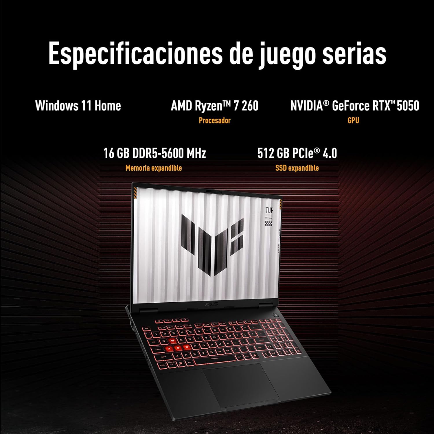 ASUS TUF A16, 2025. NVIDIA GE Force RTX 5050, 8GB DDR7/ RYZEN 7 260/NPU DEDICADA para IA, MAS DE 16 Tops/ 16 GB RAM/512 GB SSD/Teclado EN ESPAÑOL/Garantia con LA Marca EN Mexico.