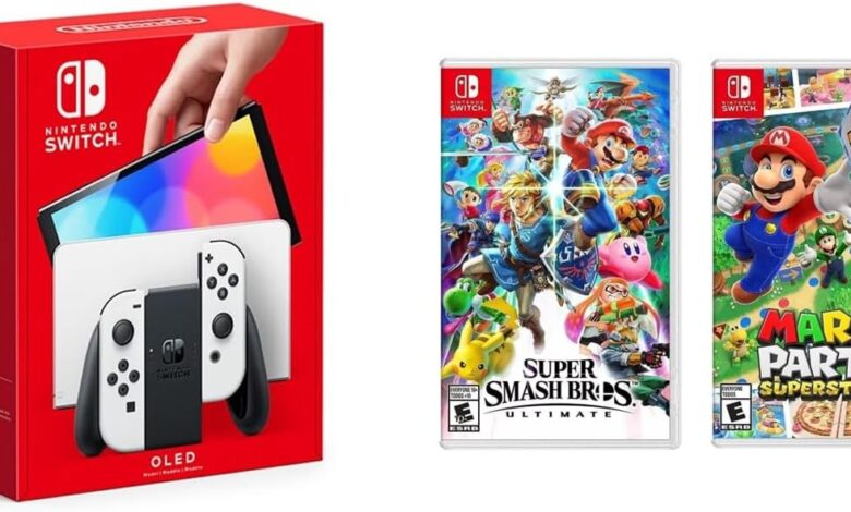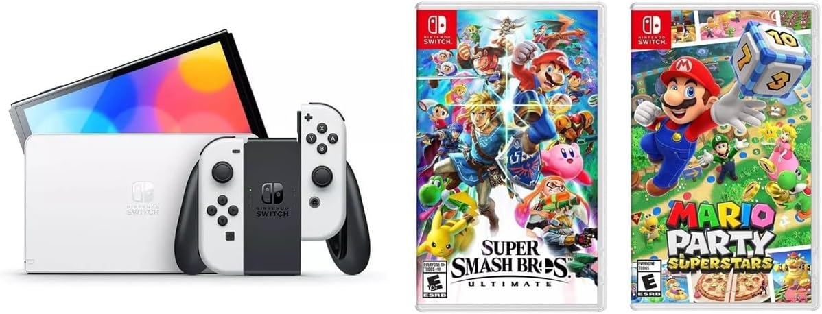 Consola Nintendo Switch – OLED 64Gb Blanco (Versión Internacional) + juegos fisicos de Super Smash Bros Ultimate Standard Edition y Mario Party Superstars
