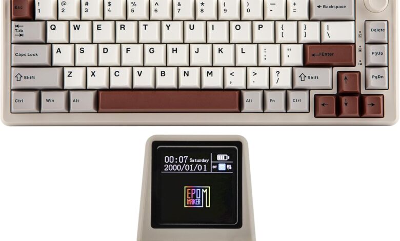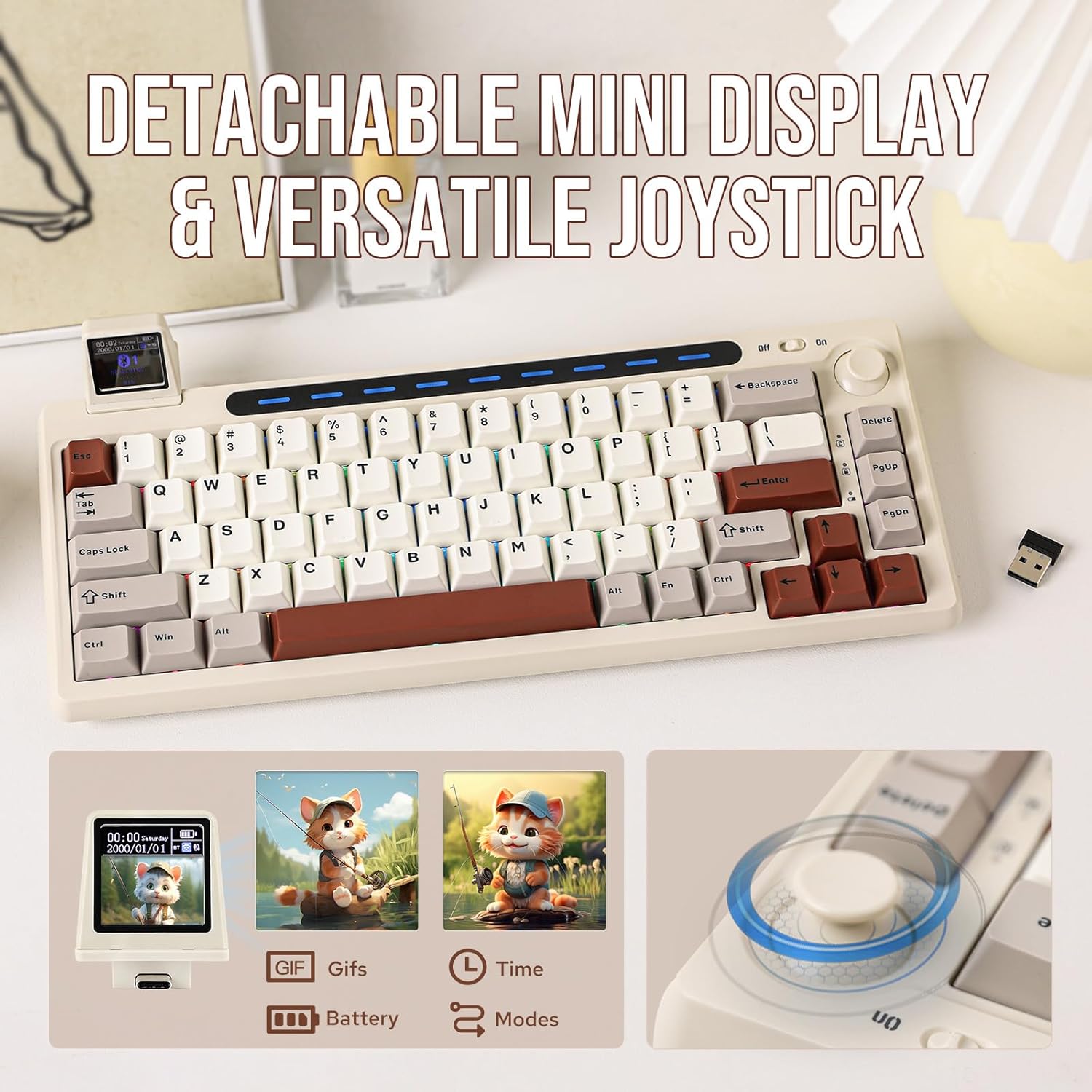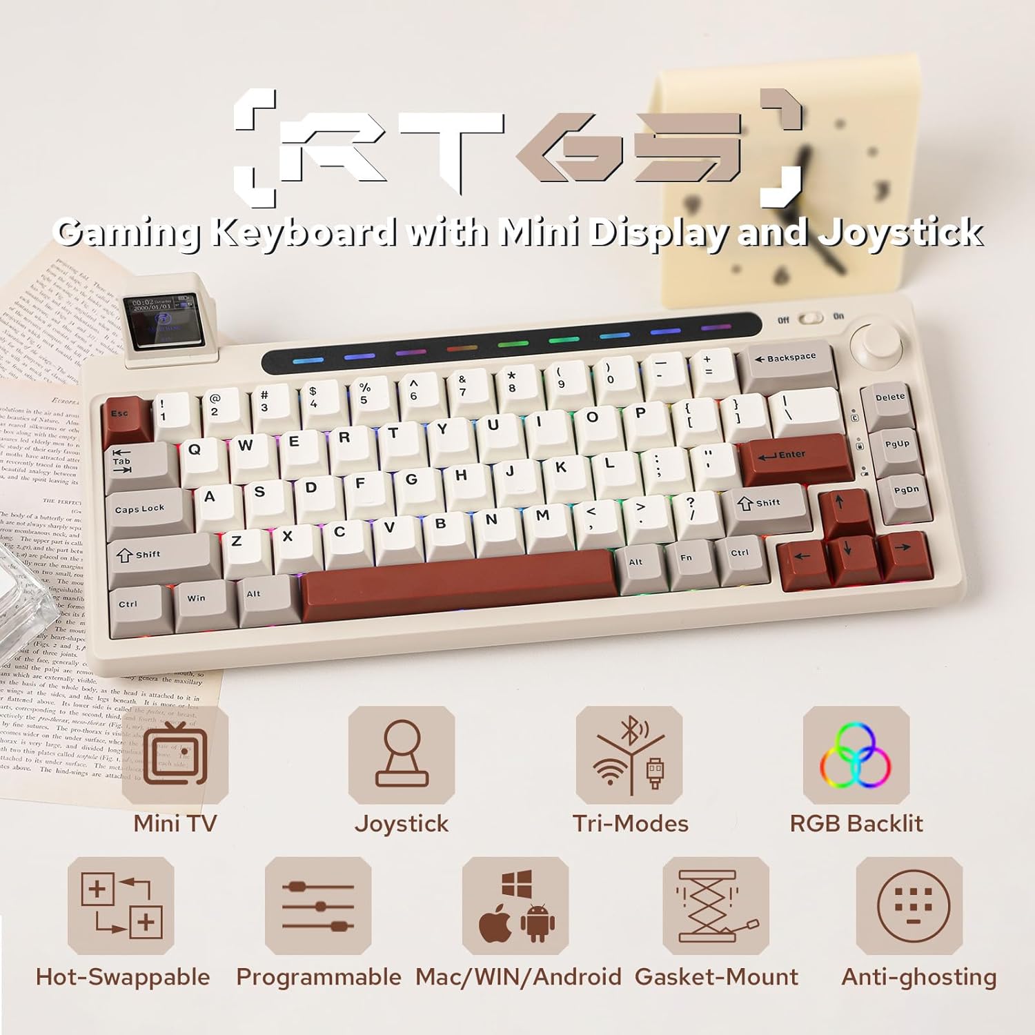 EPOMAKER RT65 Teclado Inalámbrico para Juegos, Teclado Mecánico Tri-Mode 65%, Crema Personalizada, con Mini Display y Joystick, Retroiluminación RGB, NKRO (Retro Grey, Wisteria Linear Switch)