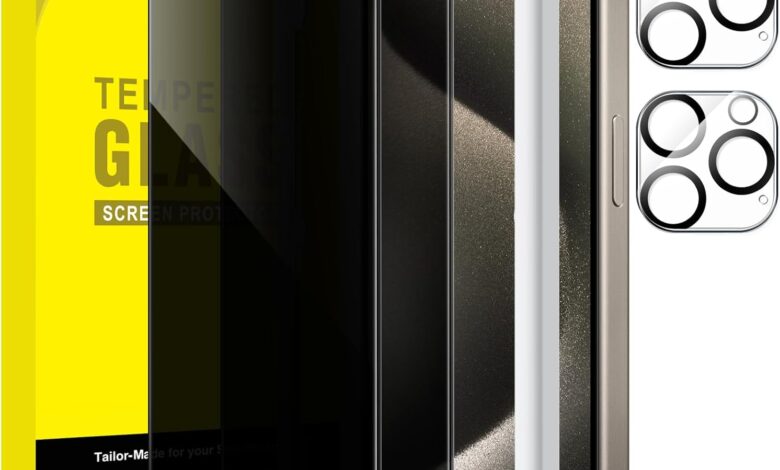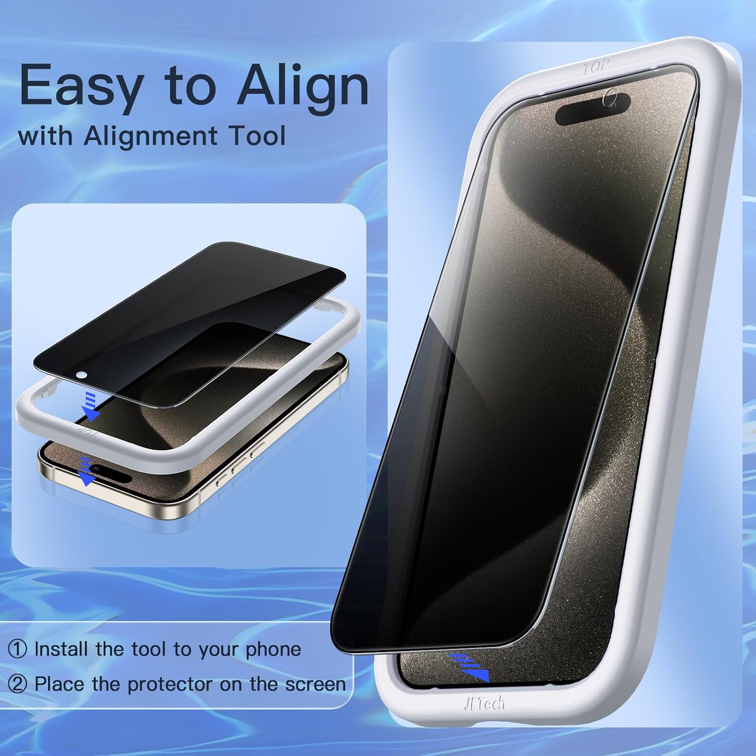 JETech Protector de Pantalla Privacidad para iPhone 15 Pro Max 6.7 Pulgadas y Protector Lente Cámara, Marco Instalación Fácil, Mica Cristal Vidrio Templado Antiespia, 2 Paquetes Cada Uno