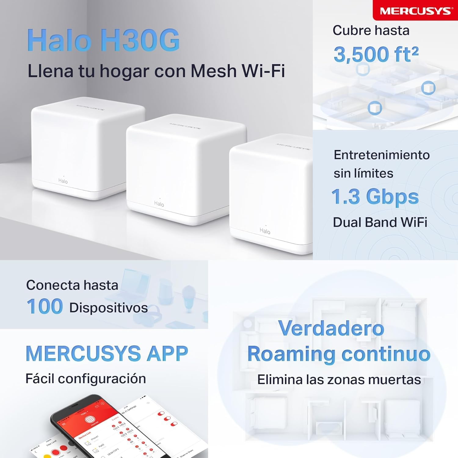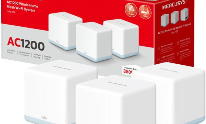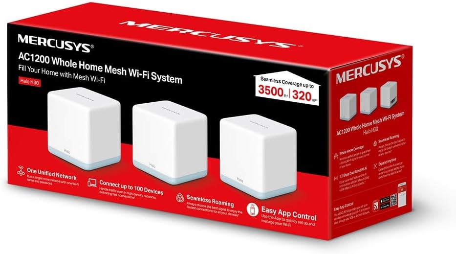 MERCUSYS Halo Mesh, Sistema WiFi Mesh para tu hogar, Doble Banda AC1200, 10/100Mbps Puertos, Cobertura de hasta 3,500 Pies Cuadrados y Más de 100 Dispositivos. Halo H30(3-Pack)