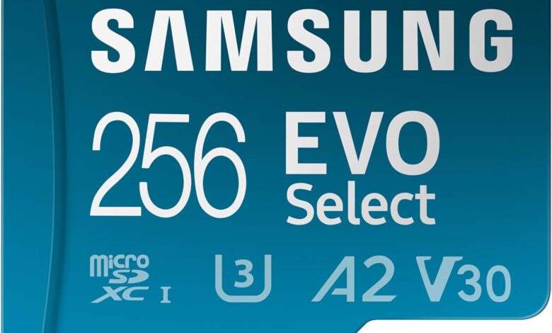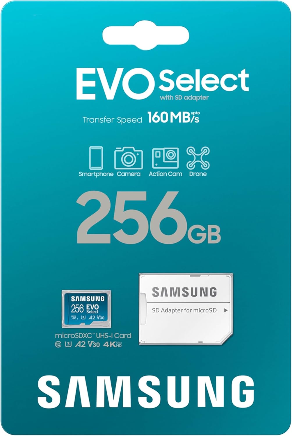 Samsung EVO Select microSDMemory Card + Adaptador, microSDXC de 256 GB, hasta 160 MB/s, 4K UHD, UHS-I, C10, U3, V30, A2, para teléfono Celular, Smartphones, Nintendo-Switch y tabletas (MB-ME256SA/AM)