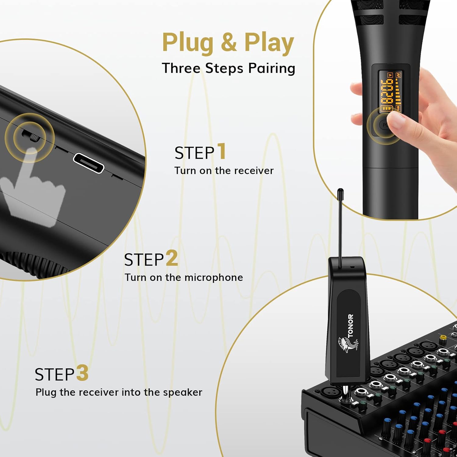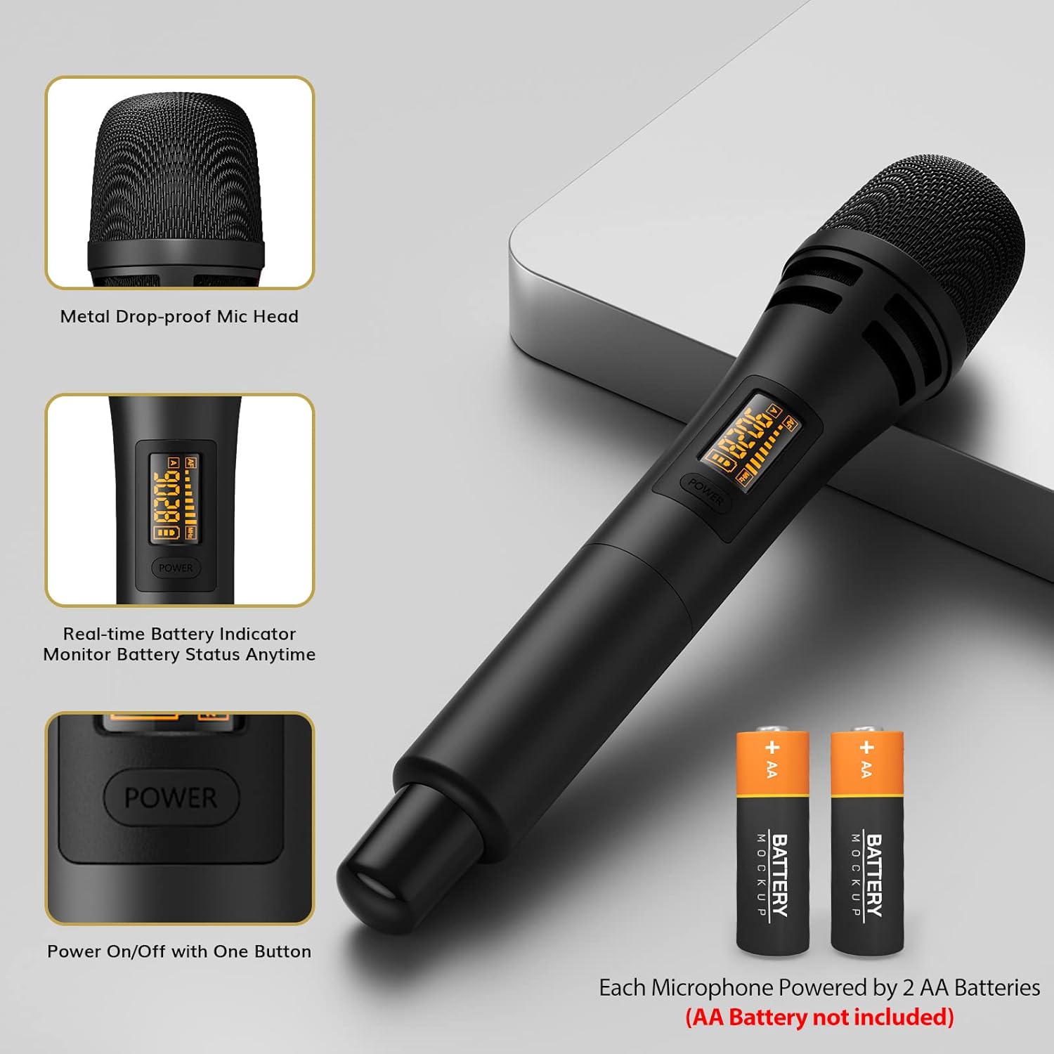 TONOR Micrófono Inalámbrico, Sistema de Micrófono Dinamico de Mano Inalámbrico de Metal UHF con Receptor Recargable, Salida de 1/4″ para Amplificador, Sistema PA, Máquina de Karaoke, 60m, Negro